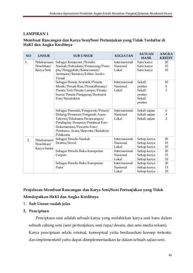 Pedoman operasional penilaian angka kredit kenaikan jabatan akademik/pangkat dosen (po 2019) ini merupakan penyempurnaan dari po 2014, yang dikembangkan dengan merujuk pada perubahan peraturan perundangan terkait serta dalam konteks menguatkan upaya peningkatan mutu dosen perguruan tinggi melalui publikasi karya ilmiahnya, termasuk karya ilmiah. Pelaksanaan pak jabatan dosen dan permen pan no. Penilaian capaian sasaran kerja januari s.d. Pedoman operasional penilaian angka kredit kenaikan jabatan akademik/pangkat dosen tahun 2019. Pedoman operasional pak kenaikan jabatan fungsional dosen ke lektor kepala dan guru besar ?