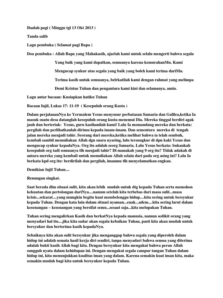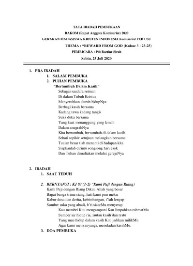 Doa pembukaan ibadah hari minggu kristen.pdf. Contoh teks kalimat doa pembukaan kegiatan ibadah di gereja kristen katolik. Tata cara ibadah pemuda remaja. Doc) ibadah gerakan pemuda gpib marga mulya | jhiane arfa irene wollah . Natal tuhan yesus kristus (1) ya tuhan allah, bapa yang di surga!